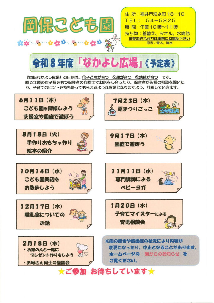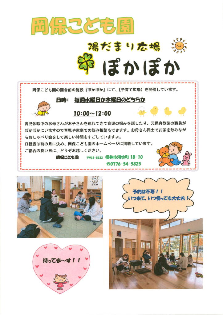 岡保こども園では、原則毎週開催の「ぽかぽか」広場(園開放)と月1回の子育て情報の提供や育児相談会を行う「なかよし広場」を開催します。詳しくは、このホームページに掲載していきますので、ご覧ください。